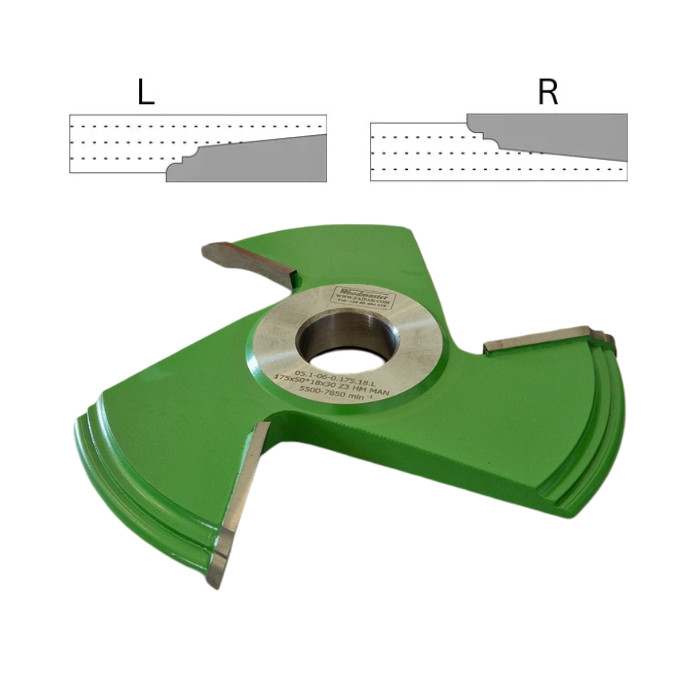 Výplnová fréza o průměru 175 mm, tloušťce 15 mm, maximální hloubce 63 mm, 3 noži, L vlevo, SK, s pájenými břity a vnitřní průměr 30 mm. Frézovací hlava Woodmaster průmyslové kvality na dřevo s noži Tigra Germany z tvrdokovu (vidia).