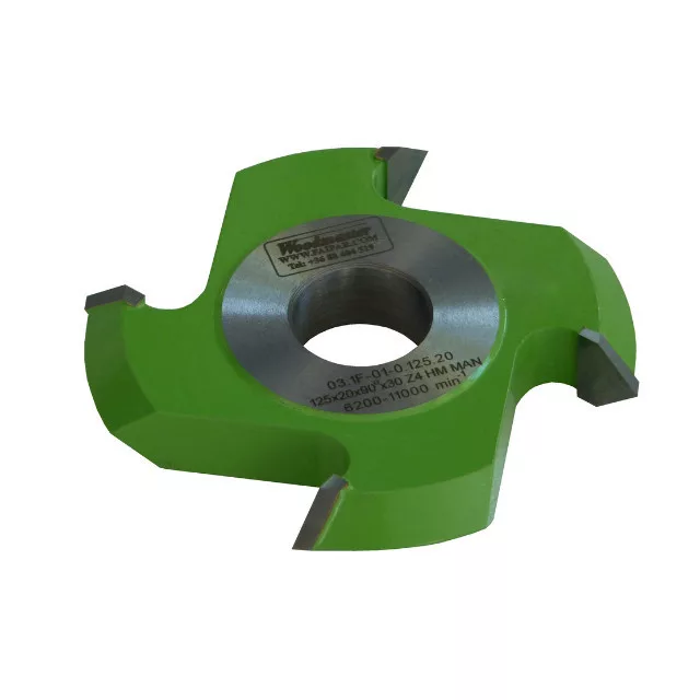 Fréza úhlová 90° o průměru 125 mm, tloušťce 20 mm, 4 noži, SK, s pájenými břity a vnitřní průměr 30 mm. Frézovací hlava Woodmaster průmyslové kvality na dřevo s noži Tigra Germany z tvrdokovu (vidia).